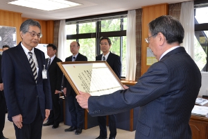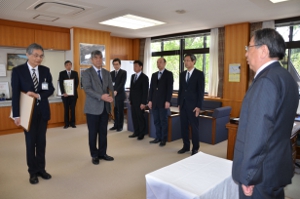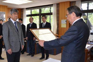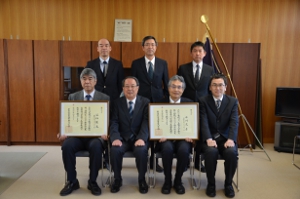 【4/18】名誉教授称号授与式を行いました。 4月18日(水)、校長室において新居浜工業高等専門学校名誉教授称号授与式が行われ、関係教職員出席のもと、平成30年3月31日付で定年退職された元教授に校長から称号記が授与されました。 名誉教授の称号を授与された方々は、次のとおりです。 (敬称略) 元機械工学科 教授 谷口 佳文(平成30年4月1日付け特任教授) 元生物応用化学科 教授 中川 克彦(平成30年4月1日付け特任教授) 谷口元教授 中川元教授 迫原校長からの祝辞 記念撮影