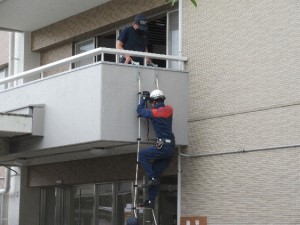 続いて実施した学寮防災避難訓練では、寮生が訓練に参加しました。地震が発生した場面を想定し、第2体育館から屋外への避難訓練を行った後、講師の方による避難梯子及びスローダン(使用者の自重で降下できる避難器具)の実演指導並びに代表学生による消火訓練を行いました。寮生たちは、災害が発生した状況を想定し、自分たちの生命を守るための方法や被害を最小限に抑えるための術を会得するため、真剣に訓練に取り組んでいました。