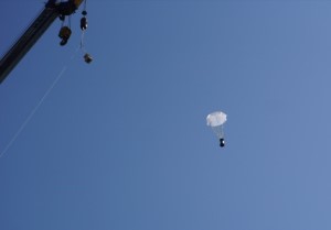 本校チームは19番目の投下で、パラシュートでの軟着陸に成功後、パラシュートを切り離し、走行を開始しました。他のチームよりゆっくりした走行でしたが、GPS受信機で取得した座標をもとに少しずつ目的地との距離を狭めていき、目的地から7.5mの距離で到着を判定して自動停止しました。