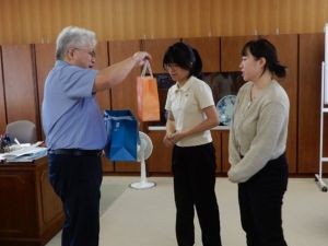 また、10月3日(金)には、同大学外語教学系の学生2名、張 詠馨 さんと李 佾璇 さんが英語実習生として来校し、10月6日(月)に東海校長に挨拶をしました。こちらは令和6年から実施しており、約5か月間の期間中、英語コミュニケーションを主に学ぶ授業(英語3Bなど)を中心に英語を教える教育実習を行います。