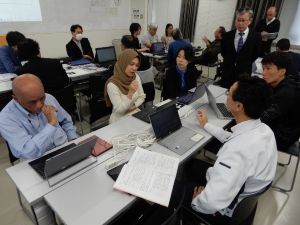 はじめに国立高専機構学務総括参事 小林 幸人 氏から研修の狙いの説明があり、その後、「①今後教育改善を進めるにあたり、ディプロマポリシー(DP)で目指す教育と現在の状況を『見える化』できる。」、「②『見える化』するための具体的な手順、進め方について修得し、ワークを通じて実践できる。」、「③DPに基づいた教育改善について、教員間で意見を出し合うことができる。」の3点を目標として、10のグループに分かれてワークを行いました。それぞれのグループワークでは、国語、英語、数学、化学などの一般科目及び専門基礎科目と5学科の専門科目の教員がそれぞれの立場で意見を出し合い、見える化を進めることで、改めて授業内容の見直しの必要性や、お互いの授業内容を知り連携することの大切さを認識でき、前向きな議論ができました。今後、この議論をさらに深め、教育改善を推進していきます。