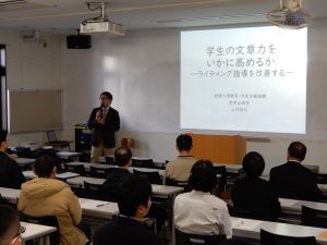 令和7年11月27日(木)、愛媛大学 上月 翔太 先生を講師にお招きし、SPOD(四国地区大学教職員能力開発ネットワーク)研修プログラム「学生の文章力をいかに高めるか―ライティング指導を改善する―」を開催し、本校教職員44名が参加しました。