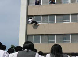 続いて行われた学寮防災避難訓練では、第1学年寮生等が訓練に臨み、代表学生による避難梯子、スローダン使用訓練、放水訓練がそれぞれ実施されました。